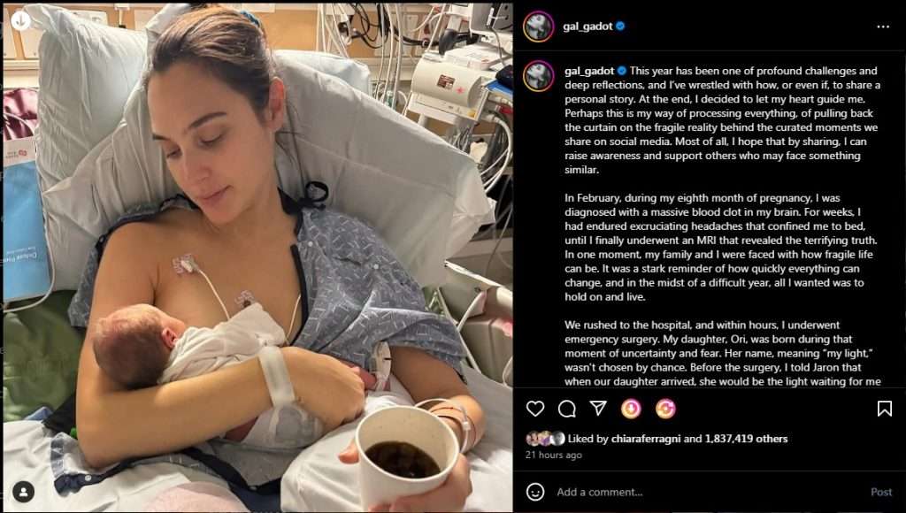 Gadot señaló que el problema obligó a que la trasladaran de urgencia al hospital donde le realizaron una cirugía inmediata. “En ese momento de incertidumbre y miedo, nació mi hija Ori”, apuntó la artista, según Variety.