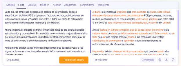 Resalta todas las palabras y frases modificadas en el resultado para facilitar la comparación. Además, esta herramienta de parafraseo permite reformular hasta 1000 palabras de una sola vez de forma gratuita.