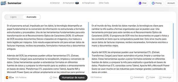 Además, ofrece dos modos de humanización: Ligero y Avanzado. Los usuarios de la versión gratuita pueden humanizar hasta 7000 palabras a la vez. Para satisfacer las necesidades de humanización de un público global, Humanizar Texto está disponible en cinco idiomas.