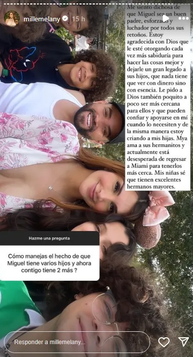 “Me siento dichosa de que Miguel sea un buen padre, esforzado y luchador por todos sus retoños. Estoy agradecida con Dios que le esté otorgando cada vez más sabiduría para hacer las cosas mejor y dejarle un gran legado a sus hijos. Que nada tiene que ver con el dinero, sino con esencia”, señaló Melany.
