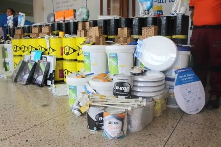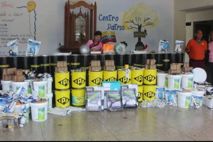 Entre los materiales entregados están pintura, brochas, rodillos con su bandeja, cableado, salas sanitarias,