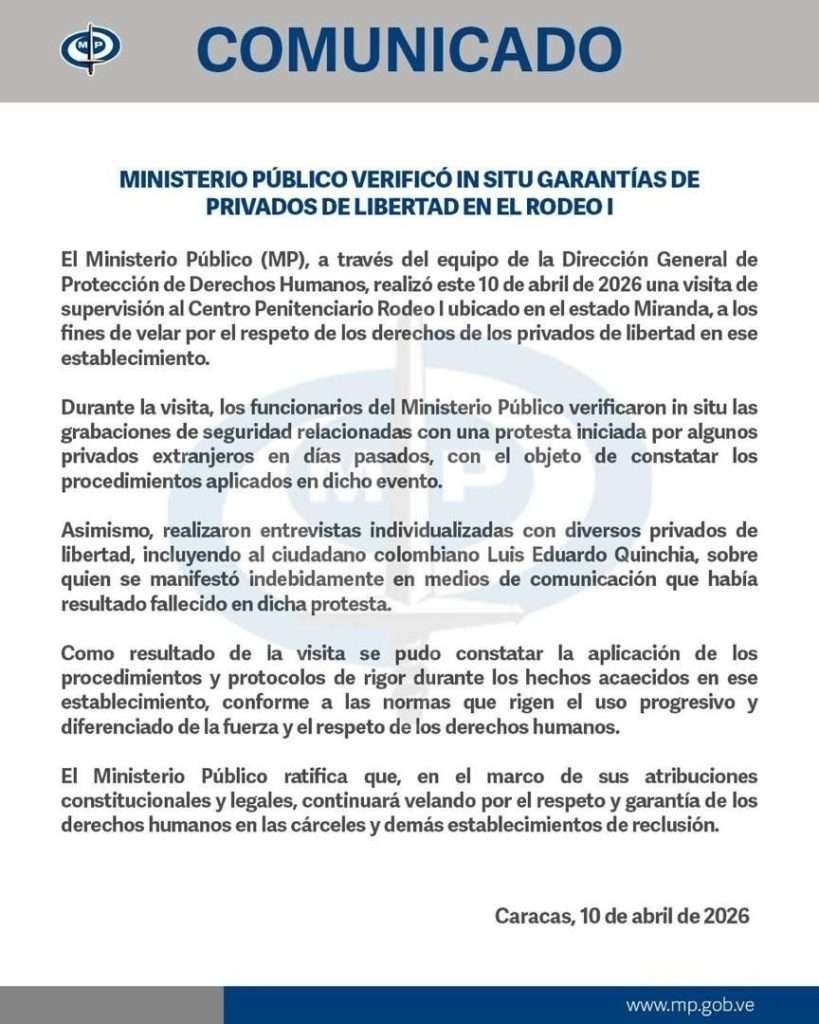 “El Ministerio Público ratifica que, en el marco de sus atribuciones constitucionales y legales, continuará velando por el respeto y garantía de los derechos humanos en las cárceles y demás establecimientos de reclusión”, reza el texto oficial.