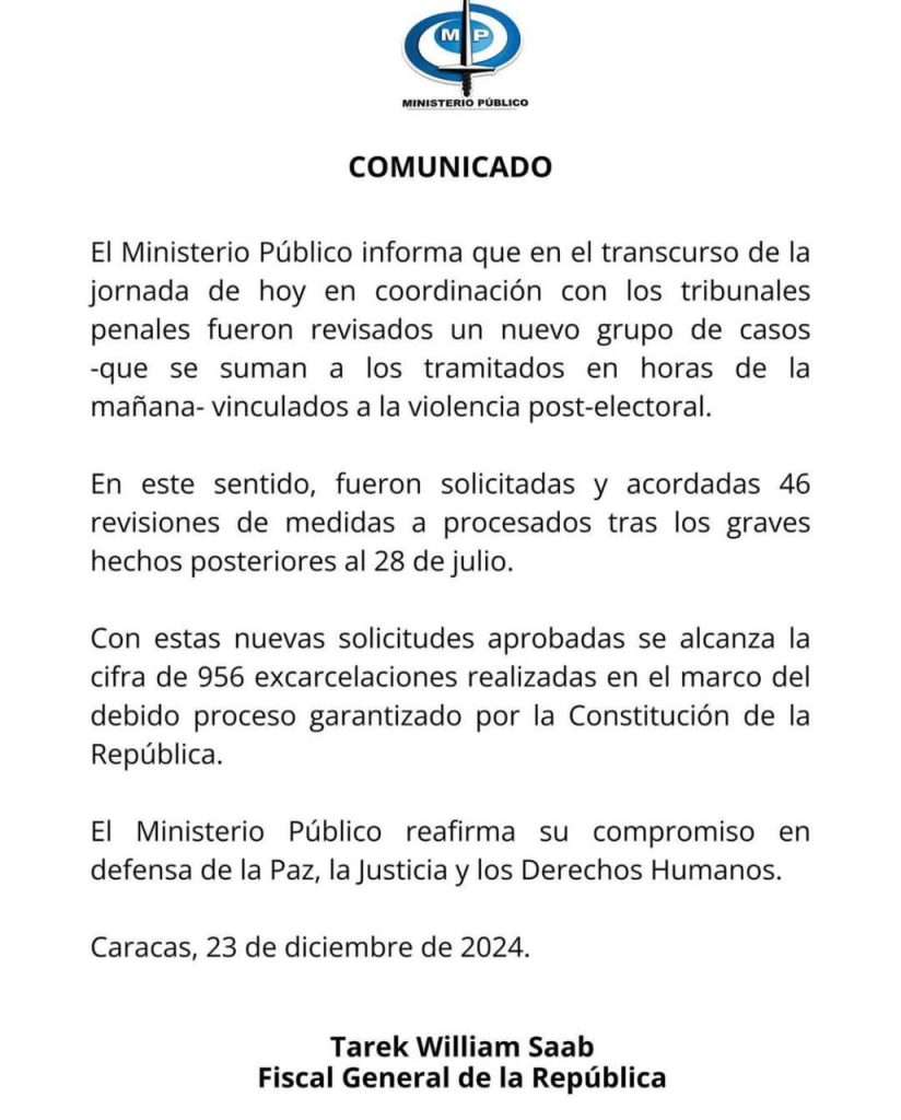 El Ministerio Público informa que en el transcurso de la jornada de hoy en coordinación con los tribunales penales fueron revisados un nuevo grupo de casos -que se suman a los tramitados en horas de la mañana- vinculados a la violencia post-electoral.