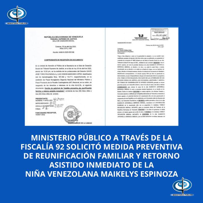 El Ministerio Público consignó ante la Sala de Casación Social del Tribunal Supremo de Justicia (TSJ), una solicitud de medida preventiva de reunificación familiar, a favor de la niña Maikelys, refiere una nota de prensa.