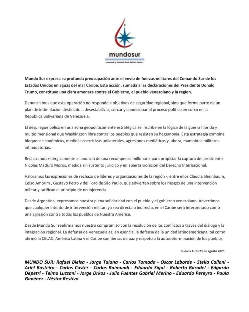 En un contexto de creciente tensión geopolítica, continúan las expresiones de solidaridad internacional con la República Bolivariana de Venezuela, el colectivo argentino Mundo Sur emitió un contundente comunicado en el que denuncia el despliegue de fuerzas militares del Comando Sur de los Estados Unidos en aguas del mar Caribe, y califica la acción como una amenaza directa contra el Gobierno y el pueblo venezolano.