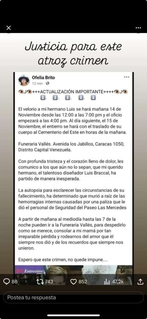 En la publicación, el diseñador contó que fue a una tienda a cambiar un tren de Navidad y ello generó una trifulca con los de seguridad del mencionado centro comercial. Los familiares aseguran en redes que la autopsia reveló hemorragias internas ocurridas tras la golpiza.
