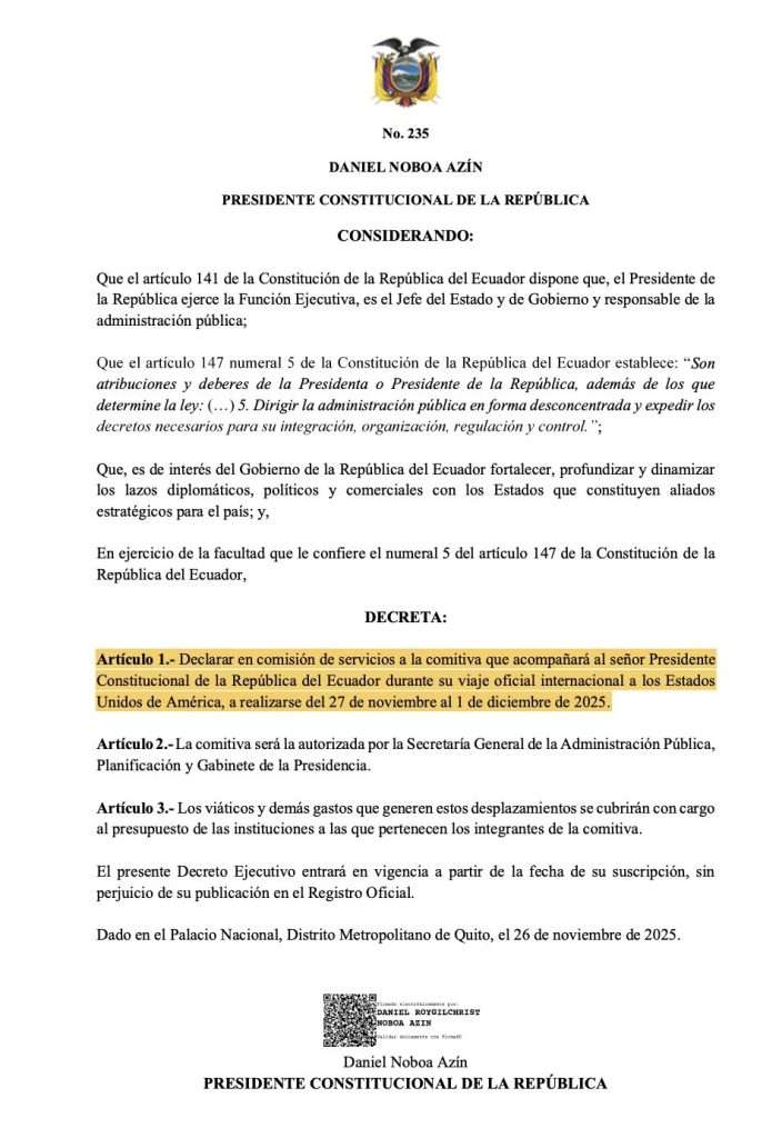 El viaje, autorizado mediante el Decreto Ejecutivo 235, establece que la comitiva presidencial estará en territorio estadounidense entre el 27 de noviembre y el 1 de diciembre de 2025, declarada en comisión de servicios.