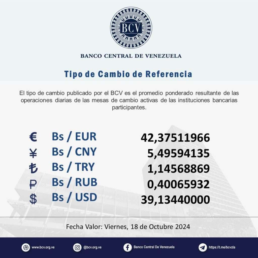 El Banco Central de Venezuela informó que las mesas de cambio de ayer arrojaron un promedio de 39,13 bolívares por dólar. Recuerda que esta es la única tasa válida para cualquier transacción del día de hoy.