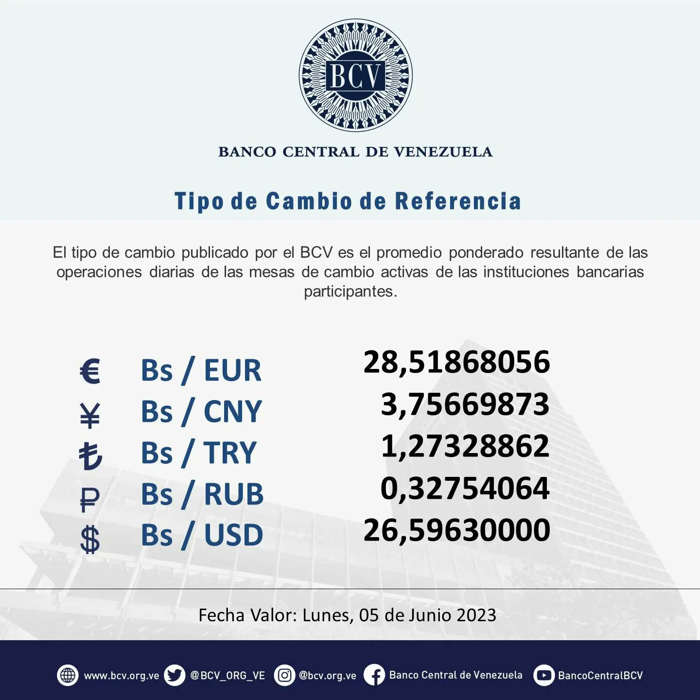 El Banco Central de Venezuela informó que las mesas de cambio de ayer arrojaron un promedio de 26,6 bolívares por dólar. Recuerda que esta es la única tasa válida para cualquier transacción del día de hoy.