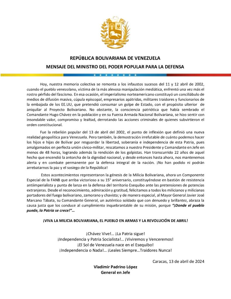 En un post en su cuenta en la red social X, el Ministro publicó un mensaje a propósito de la fecha destacando que también ese día fue la “demostración irrefutable de cuánto podemos hacer los hijos e hijas de Bolívar por resguardar la libertad, soberanía e independencia de esta Patria, pues amalgamados en perfecta unión cívico – militar, rescatamos a nuestro Presidente y Comandante en Jefe en menos de 48 horas, logrando además la rendición de los golpistas”.