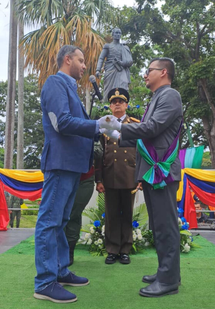 El Alcalde del Municipio Palavecino (Cabudare), Derby Guedez recibió de manos de su homólogo de Iribarren (Barquisimeto), Luis Jonás Reyes, la réplica de la espada del Libertador Simón Bolívar, este miércoles 28 de junio de 2023.