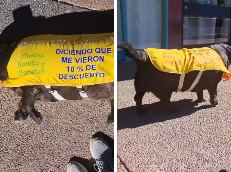 Una peluquería uruguaya hace viral su “promoción” y a su promotora. La usuaria @unaquehabla en la red social Instagram compartió el video de una perrita deambulando por las calles con un chaleco amarillo que dice: