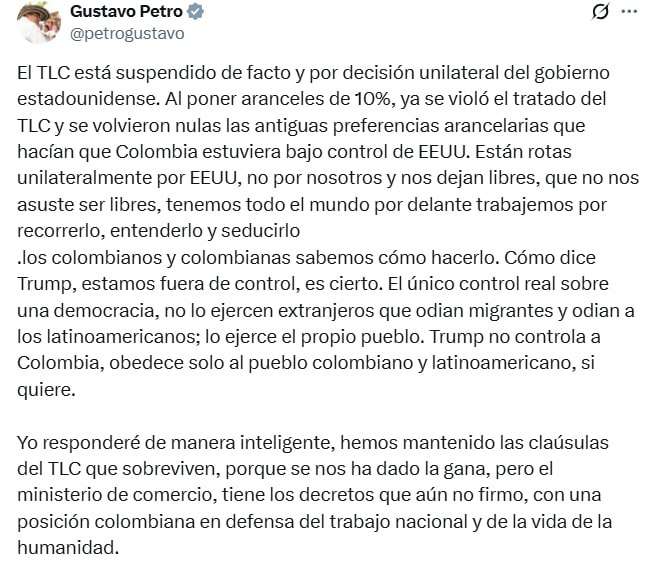 «El TLC está suspendido de facto y por decisión unilateral del gobierno estadounidense. Al poner aranceles de 10 %, ya se violó el tratado del TLC y se volvieron nulas las antiguas preferencias arancelarias que hacían que Colombia estuviera bajo control de EEUU», manifestó Petro en su cuenta de X a propósito de la nueva tensión en la relación bilateral.