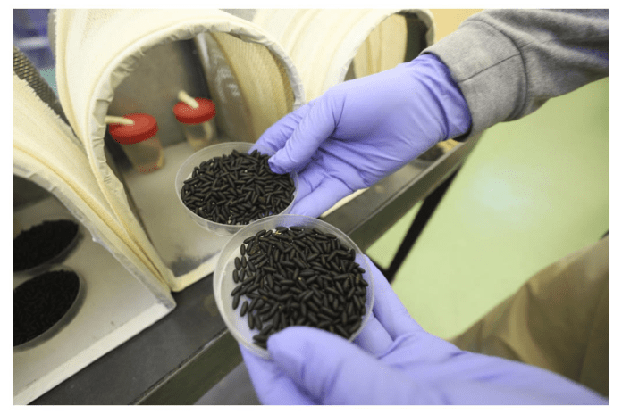 En la naturaleza, las larvas que están listas para la etapa de capullo o pupa —el equivalente a la etapa de crisálida de una mariposa— se desprenden de sus huéspedes, caen al suelo, se entierran a poca profundidad y se transforman en adultas dentro de su capullo, una envoltura protectora que les da la apariencia de una menta Tic Tac color marrón oscuro. En la fábrica de Panamá, los trabajadores las depositan en bandejas con aserrín.