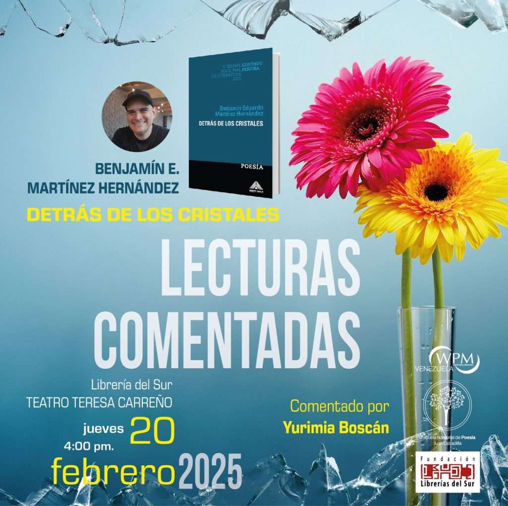 El poemario Detrás de los cristales de Benjamín Martínez se presentará este jueves 20 de febrero a las 4:00 pm, en la actividad de lecturas comentadas que promueve y organiza la Escuela Nacional de Poesía Juan Calzadilla, en la Librería del Sur del Teatro Teresa Carreño de Caracas.