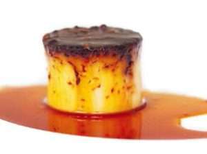 En un envase se mezclan, batiendo con un batidor, los huevos, la ralladura de limón, el azúcar, la vainilla, y poco a poco la leche hirviendo. Se retira la espuma, se cuela en un colador, y se vierte sobre el molde acaramelado.