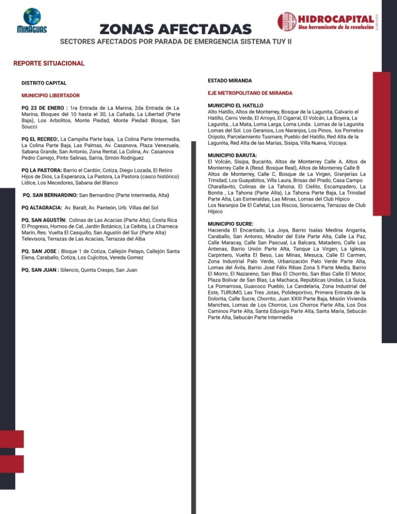 La Hidrológica de la Región Capital (Hidrocapital) informa a la población del Distrito Capital y de Miranda, que se realizará una parada de emergencia motivado a una avería presentada en la aducción principal de 72” del sistema Tuy II, en el sector La Raiza, Las Carolinas, municipio Independencia, Santa Teresa del Tuy del estado Miranda.