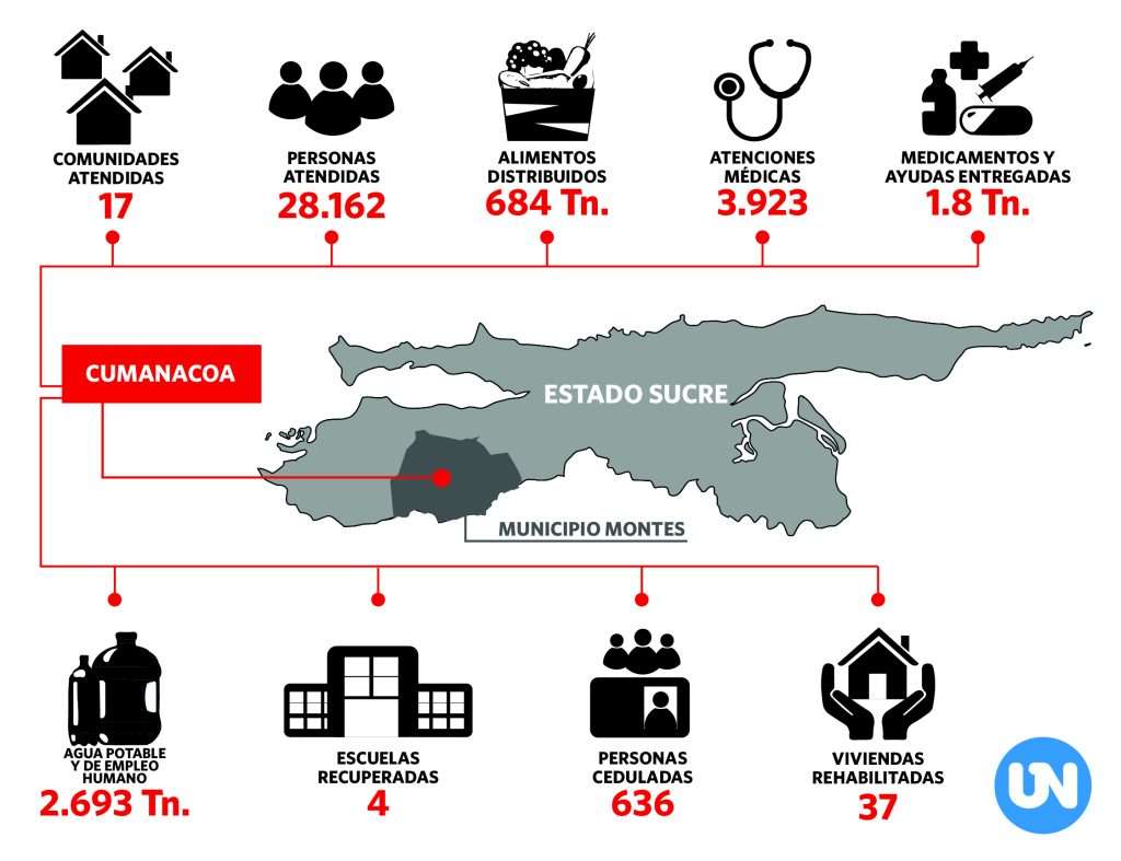 Para recuperar las casas que sufrieron daños estructurales, 292,14 toneladas de materiales de construcción serán distribuidos en Cumanacoa, informó el viceministro para Hábitat y Vivienda, Osmel Mejía. En la calle Venezuela, sector El Mercado, se inició la entrega de bloques, cementos, láminas de zinc, cables, pinturas, entre otros.