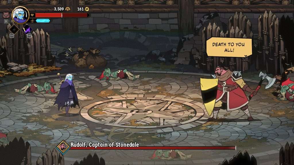 Está claro que Dotemu ha puesto muchísimo esfuerzo en la creación del mundo de Absolum, incluyendo worldbuilding, mitos, leyendas, y diálogos; sin embargo, estos esfuerzos nunca van más allá de la típica historia de fantasía, la cual es efectiva es dar una excusa para la acción, pero nunca más allá que eso. Conforme la aventura avanzó me encontré cada vez menos interesado en lo que estaba ocurriendo a nivel de trama, a pesar de que los personajes son muy carismáticos, el momento a momento de la batalla contra las fuerzas del mal resulta un tanto genérico. Absolum no sé enfoca en ello, pero si me hubiera gustado conectar más con el mundo y su narrativa.