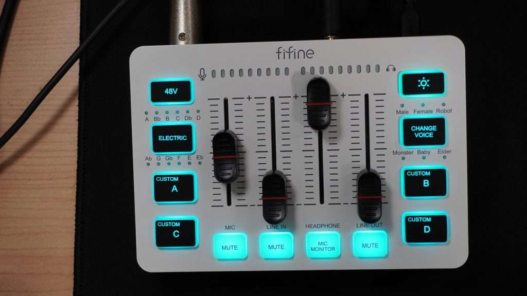 Hablando de su apariencia, el mixer es hermoso, Fifine nos envió su versión en color blanco y se ve fenomenal como contrastan los diales de volumen con el dispositivo, las luces son nítidas y uniformes, en general tiene una presentación increíble.