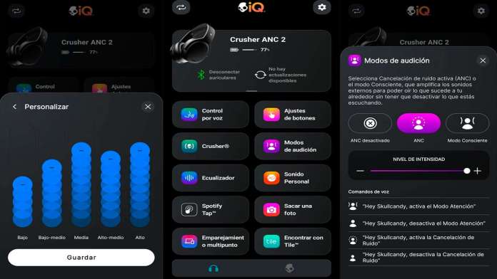 La aplicación Skullcandy IQ es el complemento perfecto para los Crusher ANC 2. Desde aquí, puedes personalizar la experiencia de audio a tu gusto. Puedes ajustar los niveles del bajo Crusher, activar/desactivar la ANC y el modo Transparencia, crear perfiles de sonido personalizados con el ecualizador, e incluso actualizar el firmware de los audífonos para obtener nuevas funciones y mejoras.
