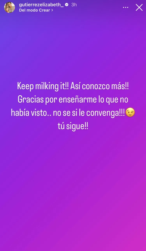 “Sigue ordeñándolo. Así conozco más. Gracias por enseñarme lo que no había visto. No sé si le convenga. Tú sigue”, fue uno de los mensajes que compartió la presentadora.