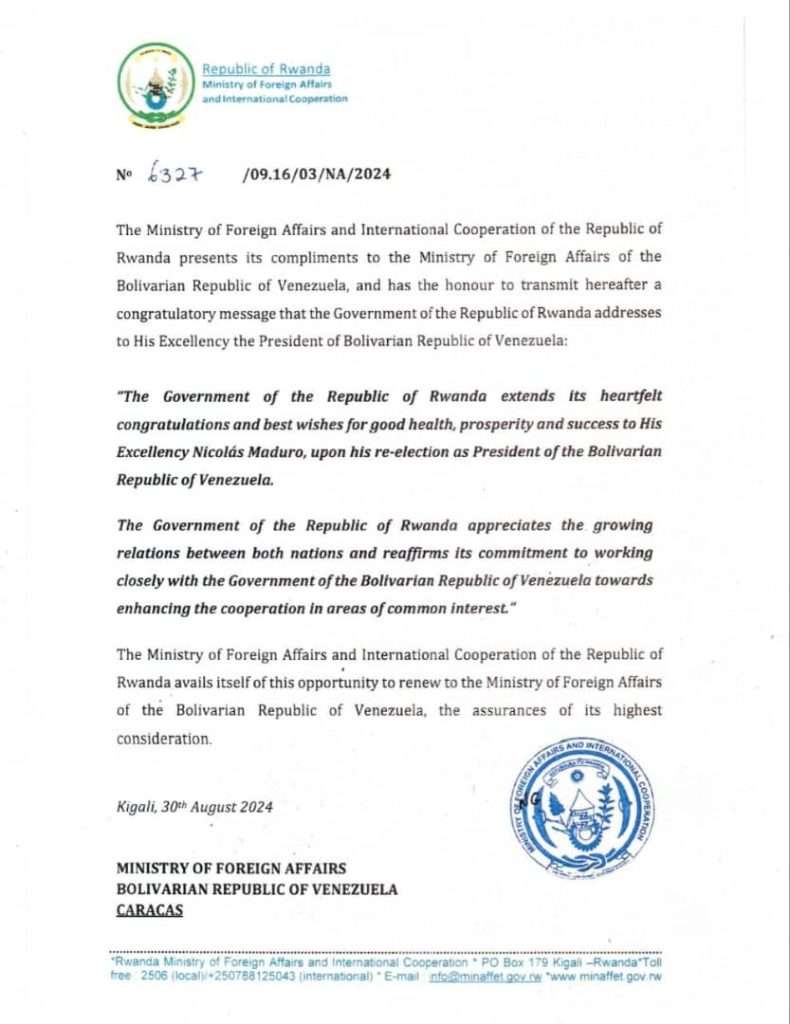 “El Gobierno de la República de Ruanda extiende sus más sinceras felicitaciones y sus mejores deseos de salud, prosperidad y éxito al Excelentísimo Señor Nicolás Maduro, por su reelección como Presidente de la República Bolivariana de Venezuela.