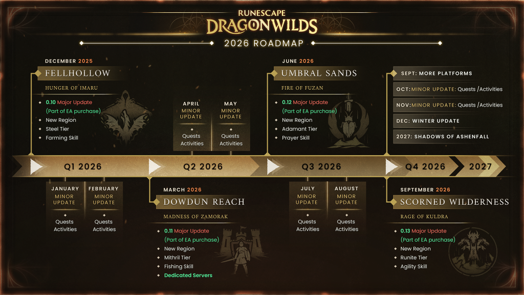 Tras lanzar la actualización Fellhollow en 2026, Jagex prepara un nuevo calendario de contenido donde mes tras mes lanzarán actualizaciones de diversas escalas con menor o mayor contenido, donde marzo, junio y septiembre de 2026 se destacan como las fechas con actualizaciones más grandes, trayendo consigo nuevas características, mecánicas, nuevas regiones, servivores dedicados, su llegada a más plataformas y mucho más.