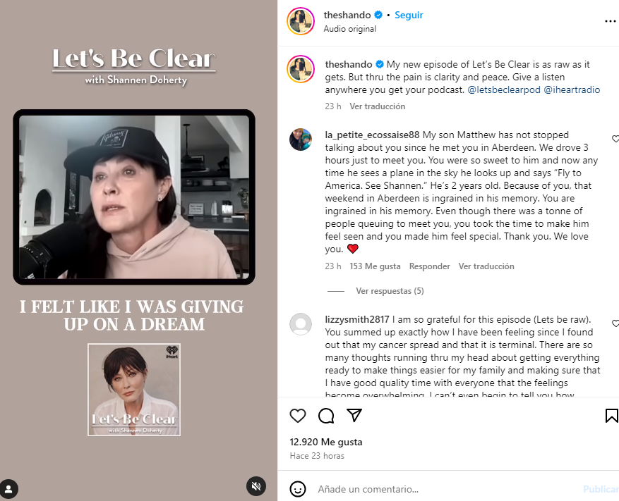Como se recordará, Shannen anunció en el 2015 que padecía cáncer de mama. Sin embargo, tras años de lucha contra esta enfermedad y de someterse a cirugías y quimioterapia, en 2023 informó que la enfermedad había hecho metástasis en el cerebro y los huesos.