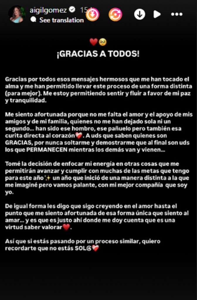 “Les digo que sigo creyendo en el amor hasta el punto de que me siento afortunada de esa forma única que siento al amar. Y es que es justo ahí donde me doy cuenta de que es una virtud saber valorar. Así que si estás pasando por un proceso similar, quiero recordarte que no estás sol@”, añadió Aigil Gómez en el escrito.
