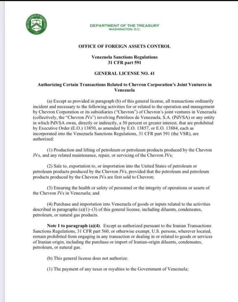 La Oficina de Control de Activos Extranjeros (OFAC, por sus siglas en inglés) del Departamento del Tesoro de Estados Unidos (EE.UU.) mantuvo la continuidad de la Licencia General 41 hasta el próximo 20 de septiembre de este año. Esta licencia autoriza “ciertas transacciones” relacionadas con los negocios conjuntos de la empresa petrolera norteamericana Chevron Corporation en Venezuela, la cual fue emitida por primera vez el el pasado 26 de noviembre de 2022, producto de la mesa de diálogo desarrollada en México.