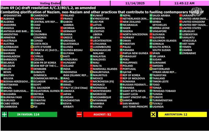 Los resultados de la votación sobre la resolución «Combatir la glorificación del nazismo» en la Asamblea General el 14 de noviembre de 2025 muestra claramente las tendencias preocupantes en el mundo
