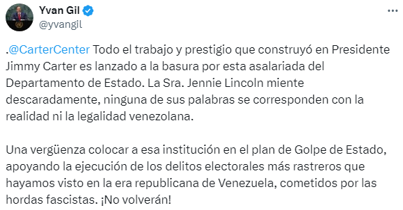 No te pierda las respuestas que dio el canciller Yván Gil tanto a Jennie Lincoln, representante del Centro Carter, como al subsecretario de Estado para América Latinas Brian Nichols.