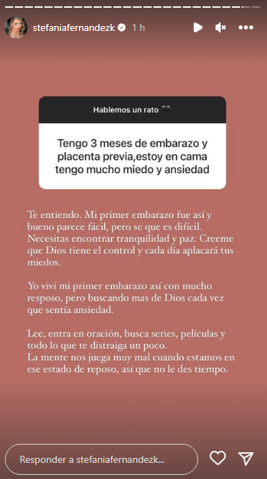 “Te entiendo, mi primer embarazo fue así, pero sé que es difícil. Necesitas encontrar tranquilidad y paz. Créeme que Dios tiene el control y cada día aplacará tus miedos”, aseguró Stefanía Fernández, quien mantiene una fe inquebrantable por Dios y es él que busca para aplacar sus miedos.