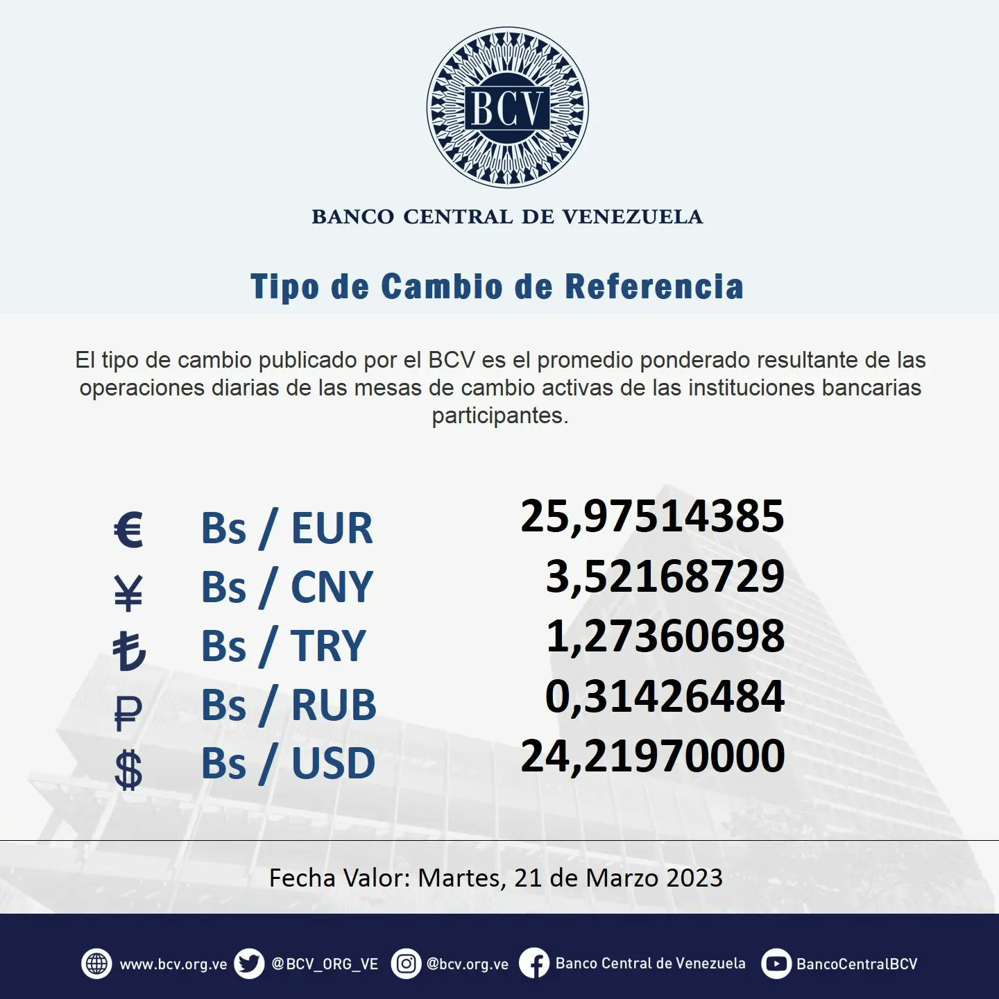 El Banco Central de Venezuela informó que las mesas de cambio de ayer arrojaron un promedio de 24,22 bolívares por dólar. Recuerda que esta es la única tasa válida para cualquier transacción del día de hoy.