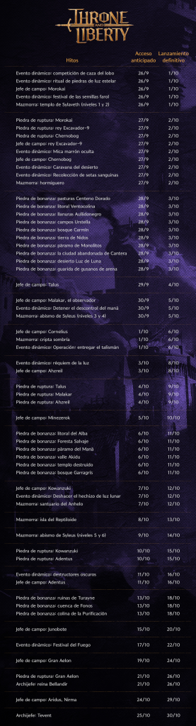 Throne and Liberty también presentó su calendario con todas las fechas que marcan cuándo se desbloqueará el contenido por primera vez para los servidores de acceso anticipado y de lanzamiento completo. Algunos contenidos se desbloquearán, pero la primera batalla o lucha puede tener lugar en un momento posterior dentro de la semana en que lleguen. Por ejemplo, los gremios deberán declarar las batallas de Piedra de bonanza y Piedra de ruptura, y los jefes tendrán apariciones programadas.