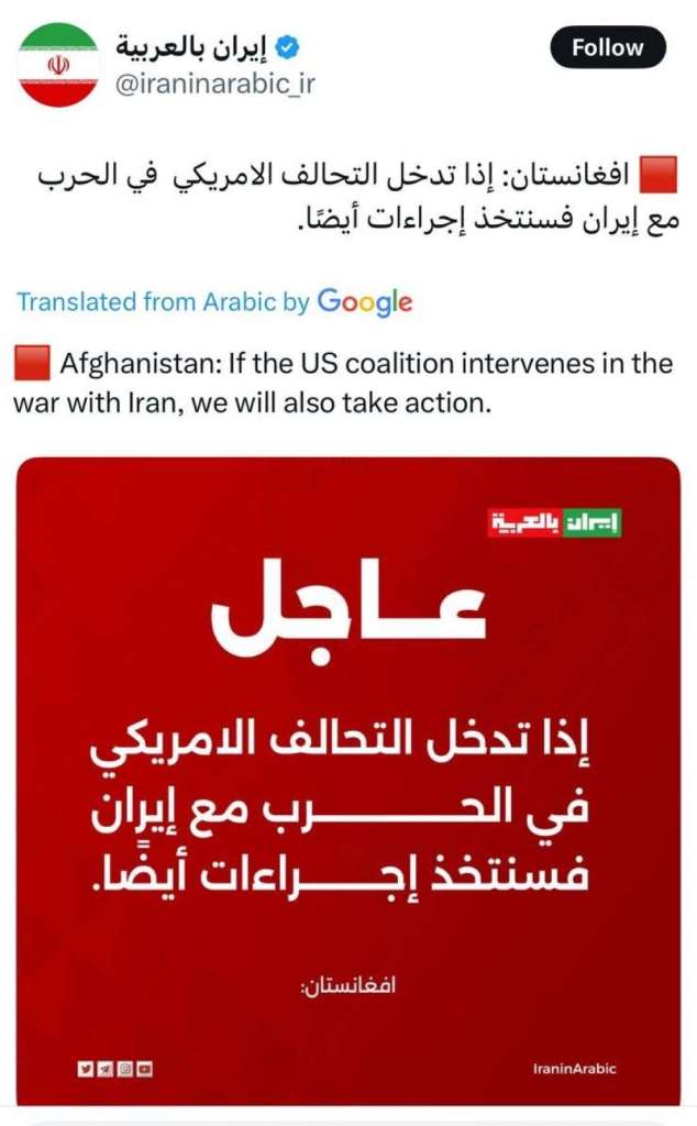 En sus redes sociales, el medio anuncia lo siguiente: “Afganistán ha lanzado una dura advertencia: Si Estados Unidos se suma a la acción militar contra Irán, “nosotros también tomaremos medidas”.