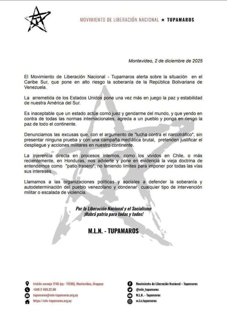En la misiva, El Movimiento de Liberación Nacional – Tupamaros señala que la arremetida de los Estados Unidos pone una vez más en juego la paz y estabilidad de nuestra América del Sur.