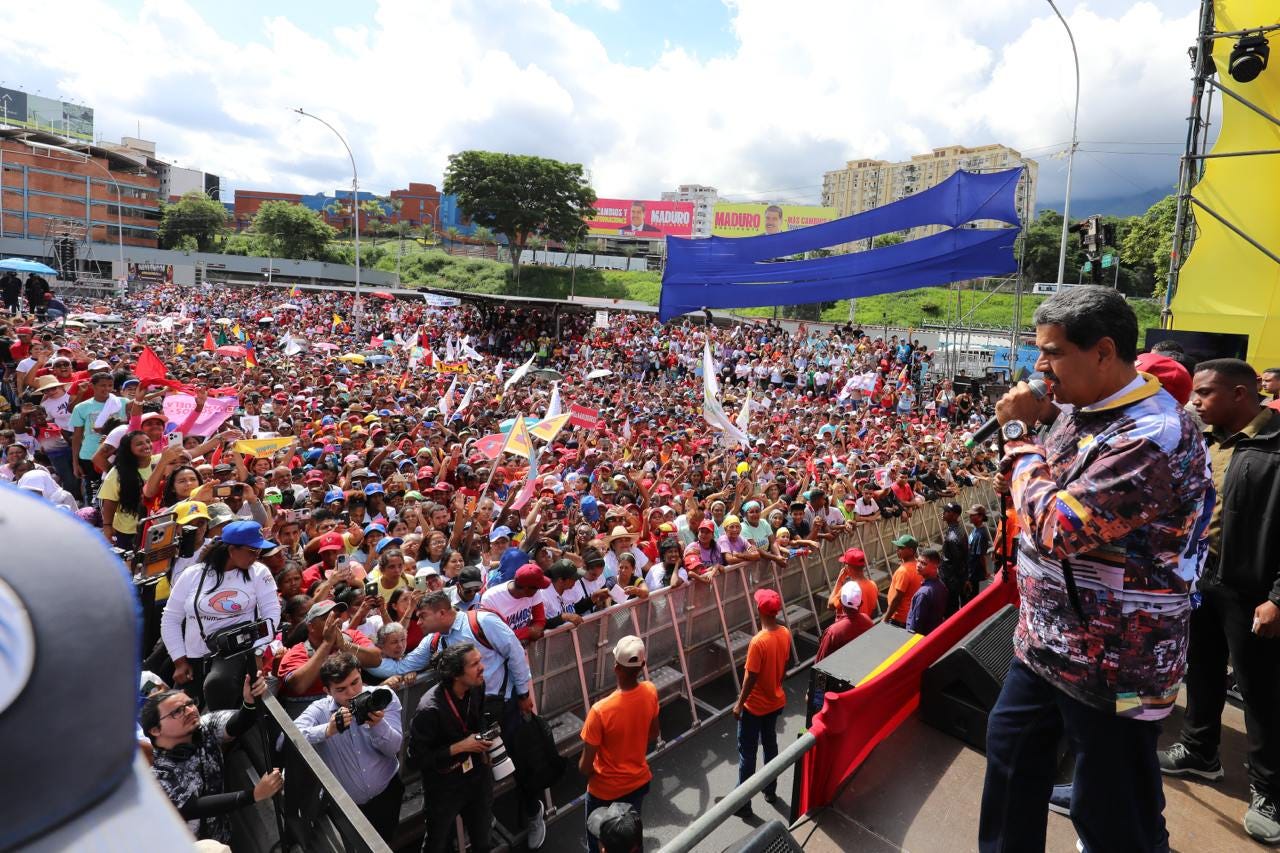 “Quieren una hecatombe y una tragedia para gritar suspensión de las elecciones y saldrían los gringos, saldría Milei, saldría Novoa de la derecha a pedir suspendan las elecciones”, denunció el presidente Maduro desde un acto de campaña en la redoma de Petare, donde enfatizó que “llueve, truene o relampaguee” el 28 de julio habrá elecciones.