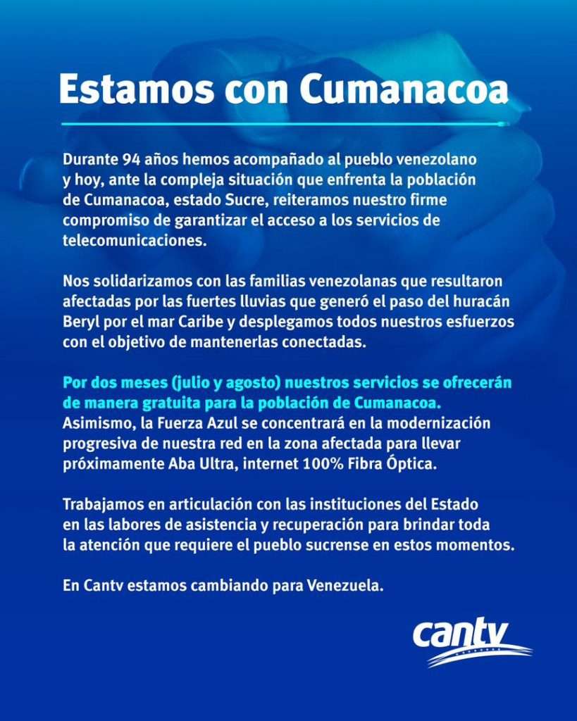 “Por dos meses, julio y agosto, nuestros servicios se ofrecerán de manera gratuita, para la población de Cumanacoa. Asimismo, la Fuerza Azul se concentrará en la modernización progresiva de nuestra red en la zona afectada para llevar próximamente Aba Ultra, internet 100% Fibra Óptica”, refiere el comunicado.