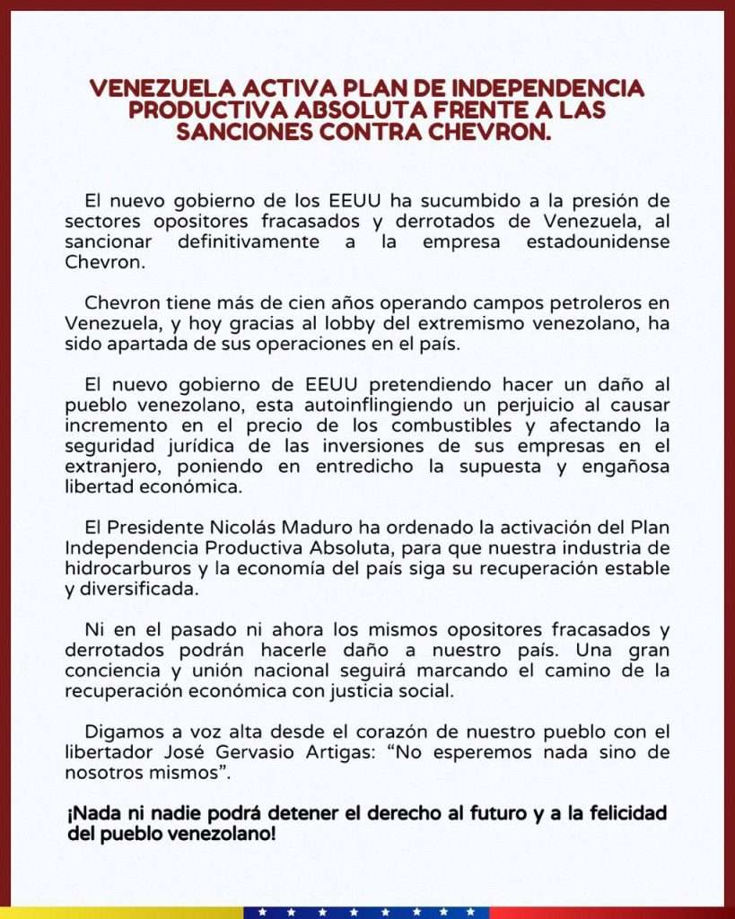 A través de un comunicado presentado por la vicepresidenta Ejecutiva, Delcy Rodríguez, el gobierno bolivariano anunció la ejecución del Plan independencia productiva tras sanciones contra Chevrón, para que nuestra industria de hidrocarburos y la economía del país siga su recuperación estable y diversificada.