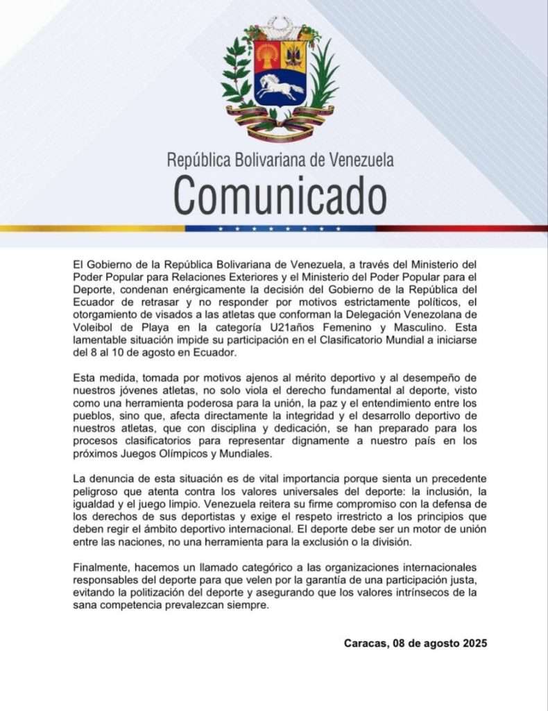 El Gobierno de la República Bolivariana de Venezuela, a través del Ministerio del Poder Popular para Relaciones Exteriores y el Ministerio del Poder Popular para el Deporte, emitió un comunicado oficial en el que condena enérgicamente la decisión del Gobierno de la República del Ecuador de retrasar y no otorgar los visados correspondientes a las atletas de la Delegación Venezolana de Voleibol de Playa en la categoría U21, tanto femenina como masculina.
