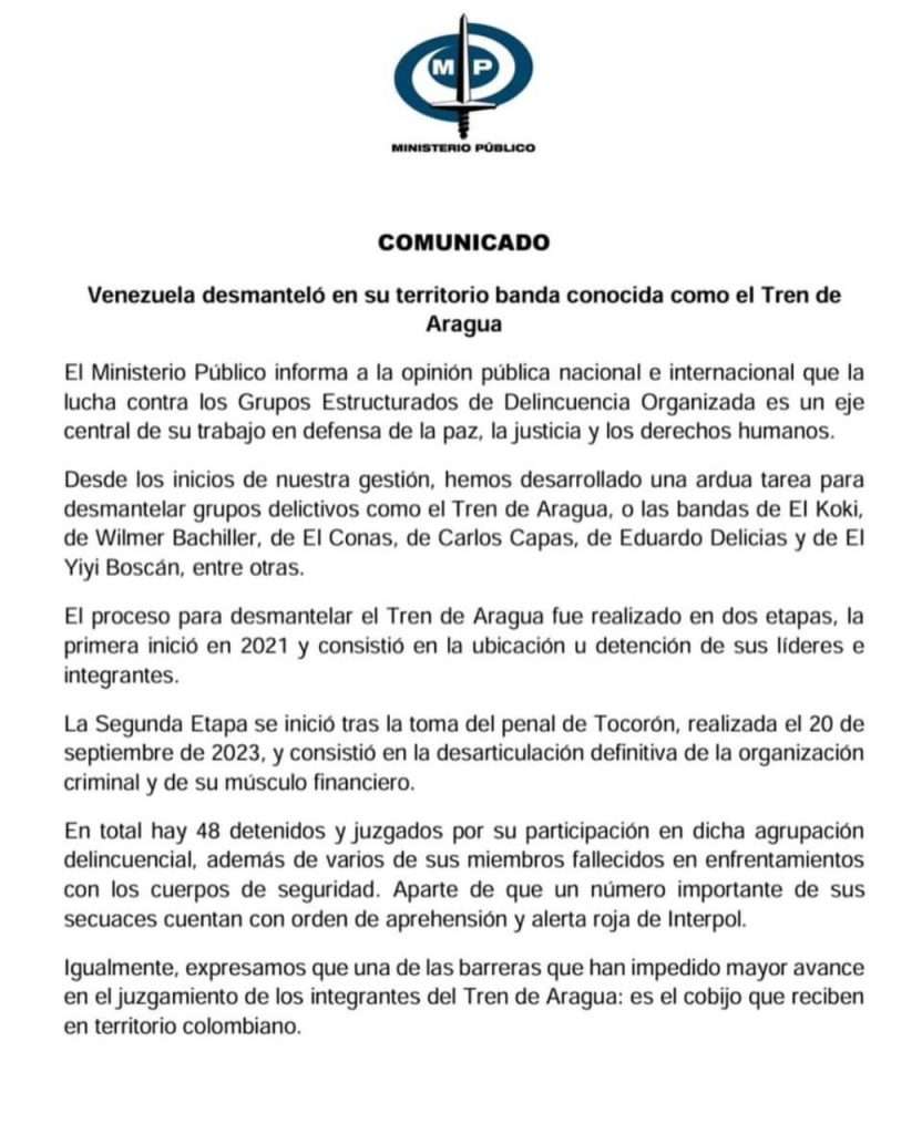 Desde su cuenta oficial en la red social Instagram el MP explicó que el proceso para desmantelar el Tren de Aragua fue realizado en dos etapas; la primera inició en 2021 y consistió en la ubicación y detención de sus líderes e integrantes.