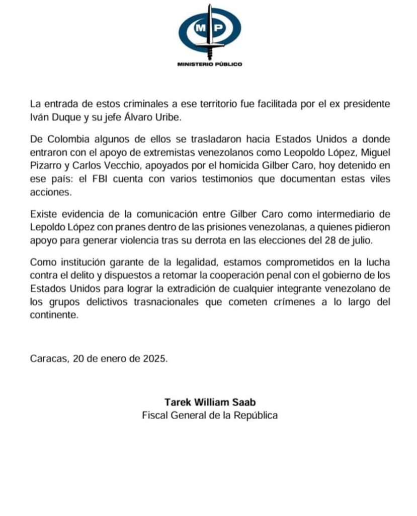 En la misiva, el MP denunció que integrantes del grupo delincuencial conocido como el Tren de Aragua entraron a Estados Unidos (EEUU) con el apoyo de opositores de la extrema derecha como Leopoldo López, Miguel Pizarro y Carlos Vecchio, y afirmó que el FBI cuenta con testimonios que documentan estas acciones.