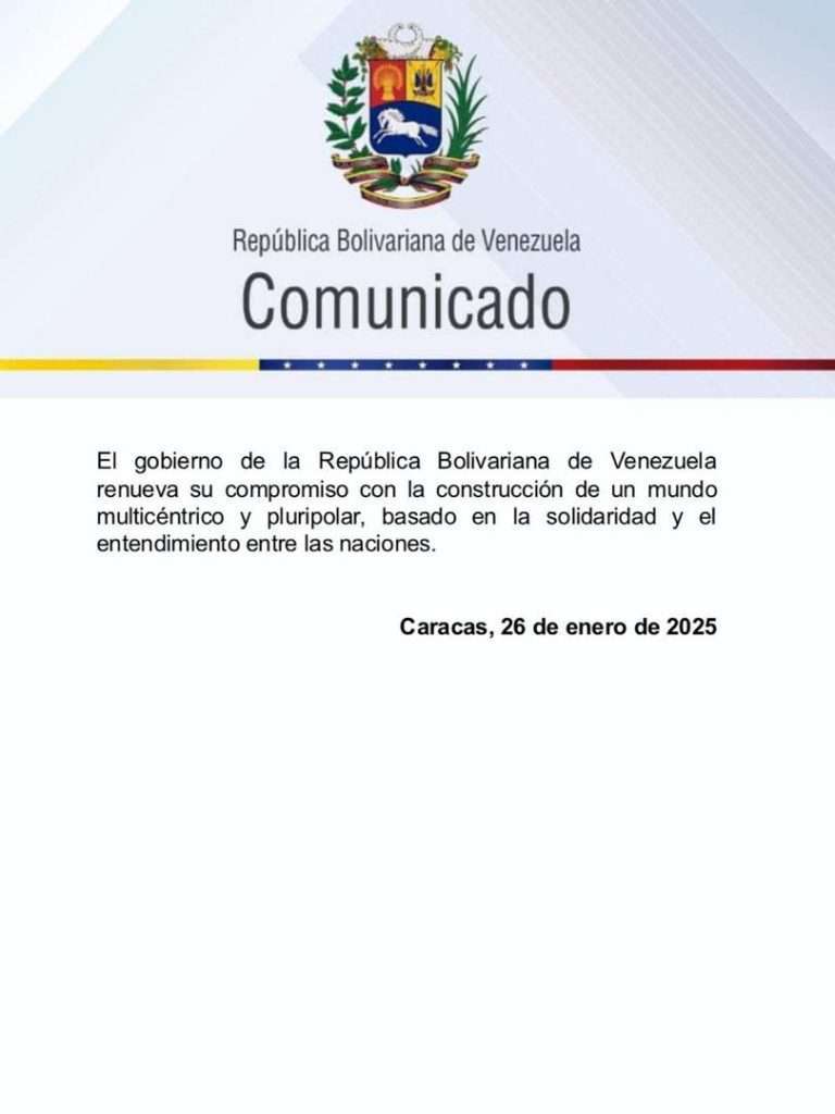 El gobierno de la República Bolivariana de Venezuela renueva su compromiso con la construcción de un mundo multicéntrico y pluripolar, basado en la solidaridad y el entendimiento entre las naciones.