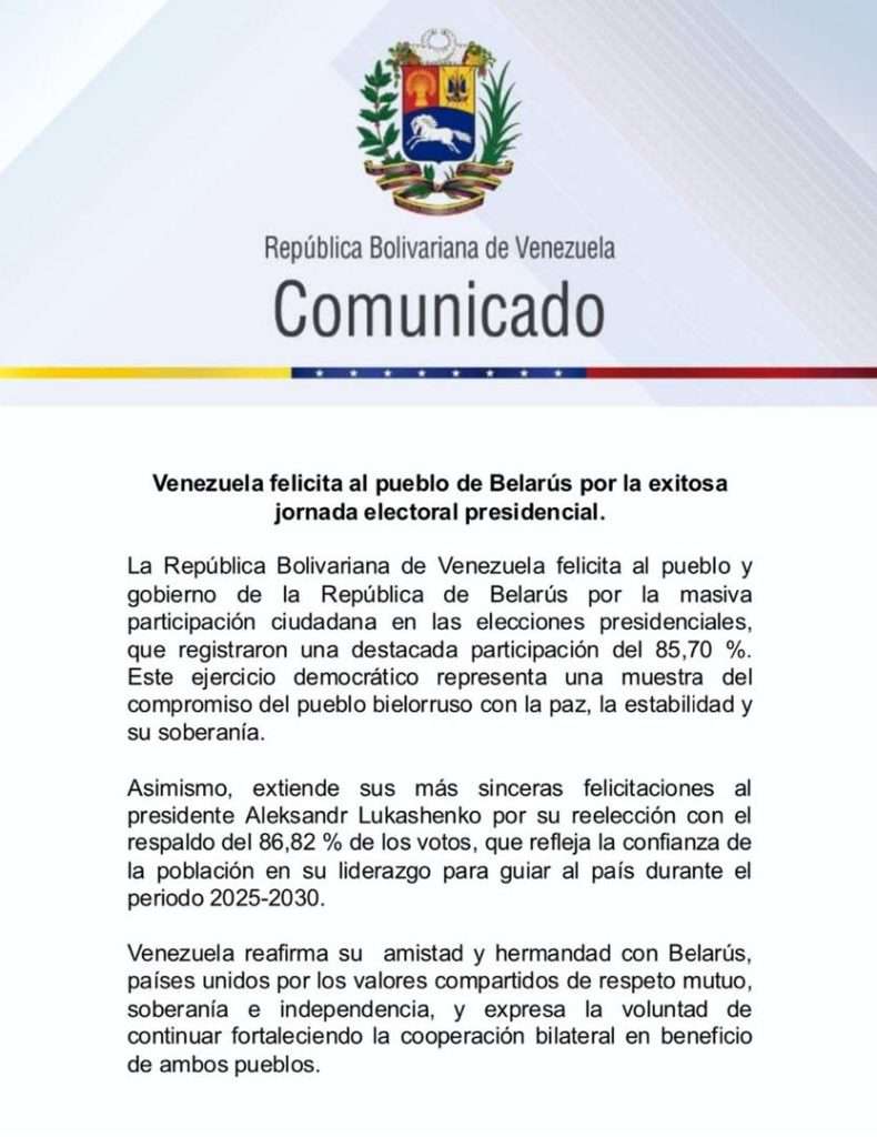 La República Bolivariana de Venezuela felicita al pueblo y gobierno de la República de Belarús por la masiva participación ciudadana en las elecciones presidenciales, que registraron una destacada participación del 85,70 %. Este ejercicio democrático representa una muestra del compromiso del pueblo bielorruso con la paz, la estabilidad y su soberanía.