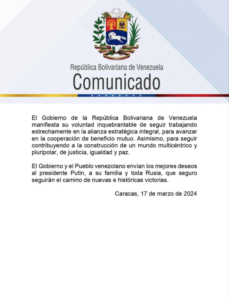 Por medio de un comunicado Oficial, Venezuela hizo extensivo su reconocimiento al glorioso Pueblo ruso, por su profundo compromiso con la democracia, expresado en su extraordinaria participación en esta jornada electoral.