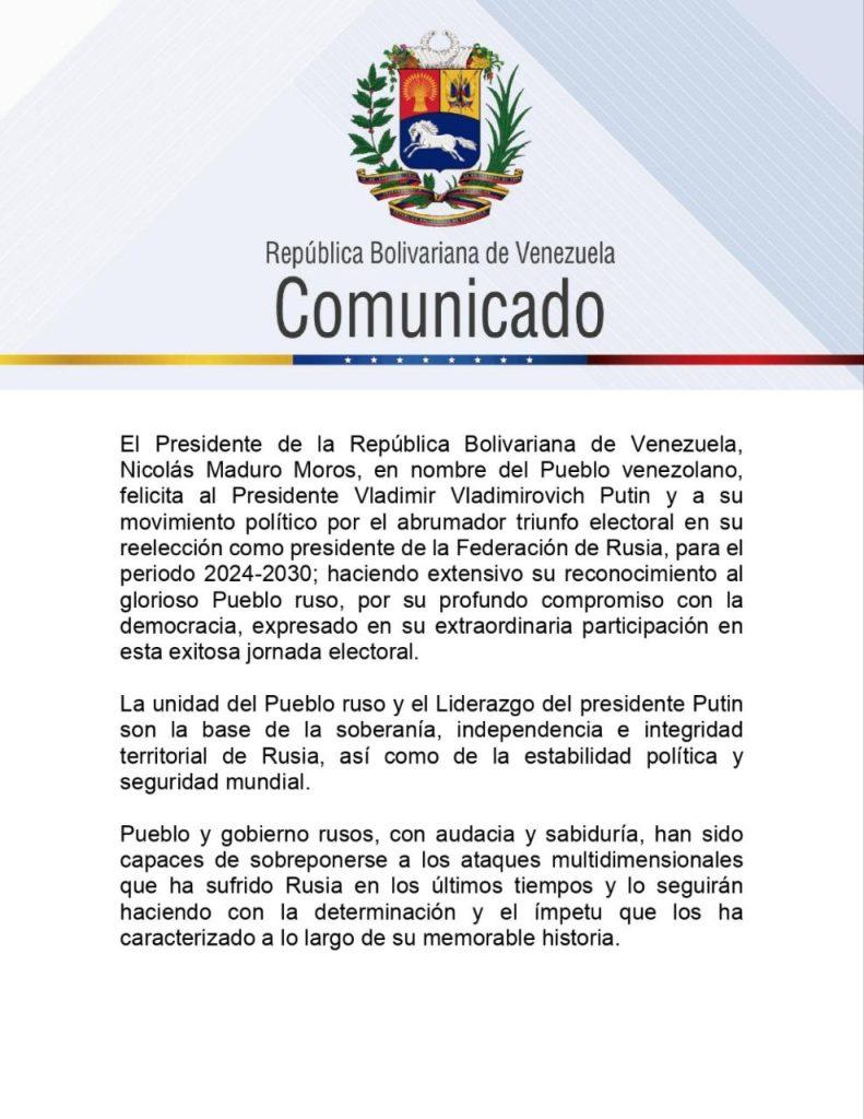 El Presidente de la República Bolivariana de Venezuela, Nicolás Maduro, en nombre del Pueblo venezolano, felicitó este domingo al Presidente Vladimir Vladimirovich Putin y a su movimiento político por el triunfo electoral en su reelección como presidente de la Federación de Rusia, para el periodo 2024-2030.