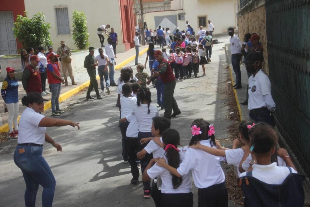 Desde las 10:00 am comenzó el despliegue de seguridad y evacuación en la Escuela República de Panamá en La Guaira, donde docentes, estudiantes, personal obrero y administrativo realizaron una ruta de escape seguro, por la calle El Medio del sector El Cardonal.