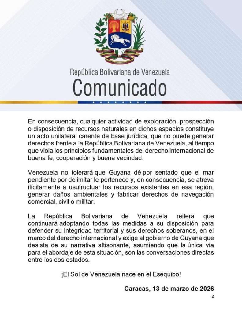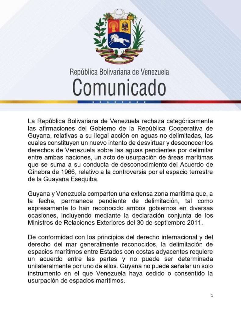 A través de un comunicado publicado por el canciller Yván Gil, en su canal de Telegram, se indica que se trata de un acto de usurpación sobre las áreas marítimas, por parte de Guyana, que se suma a su conducta de desconocimiento del Acuerdo de Ginebra de 1966 relativo a la controversia por el espacio terrestre de la Guayana Esequiba.